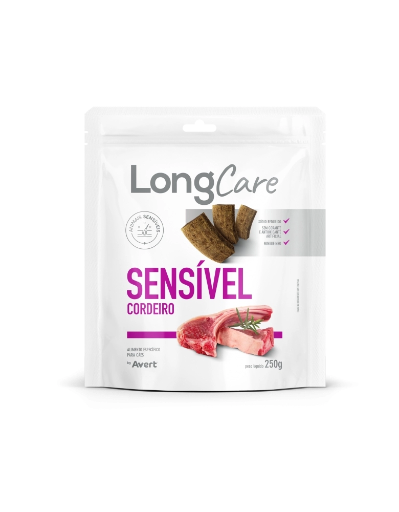 Long Care é um petisco natural e funcional composto por nutrientes essenciais para cães sensíveis a proteínas comuns.