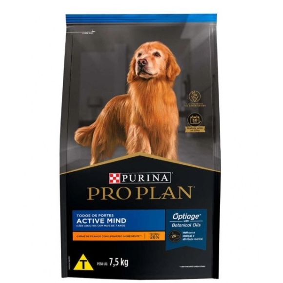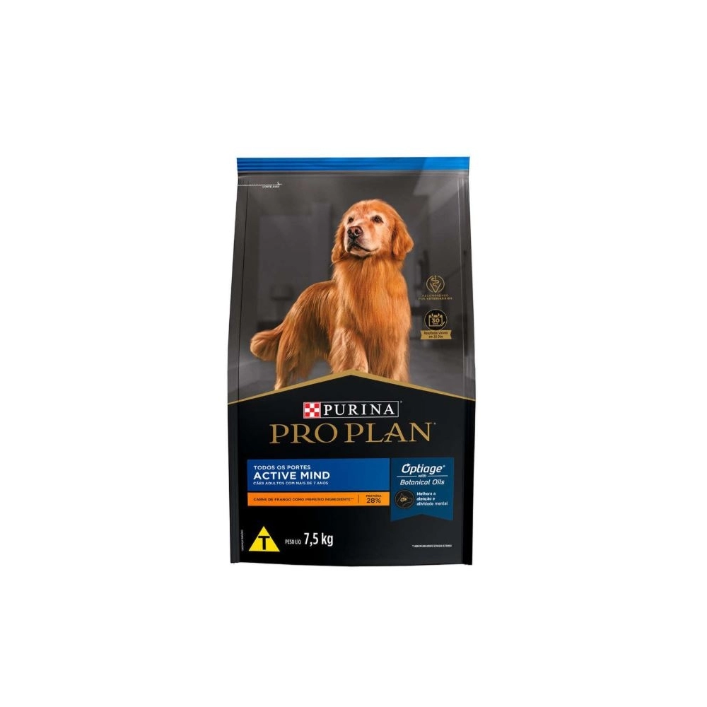 A Purina Pro Plan Active Mind 7+ é uma ração super premium desenvolvida especialmente para cães adultos a partir dos 7 anos de idade, de todos os portes. Sua fórmula exclusiva com a tecnologia OptiAge®, enriquecida com óleos botânicos e antioxidantes naturais, ajuda a estimular a memória, a atenção e a agilidade mental, promovendo uma vida mais ativa e saudável na maturidade.