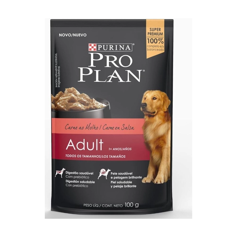 Ração Úmida Pro Plan Adulto – Sabor Carne (100 g) caixa com 15 unidades.