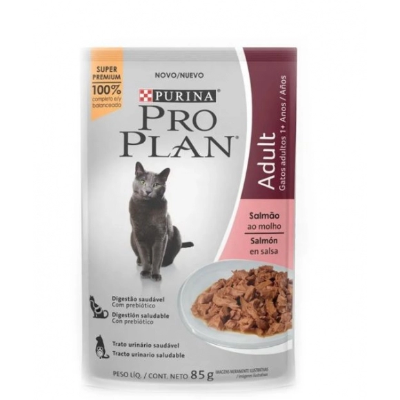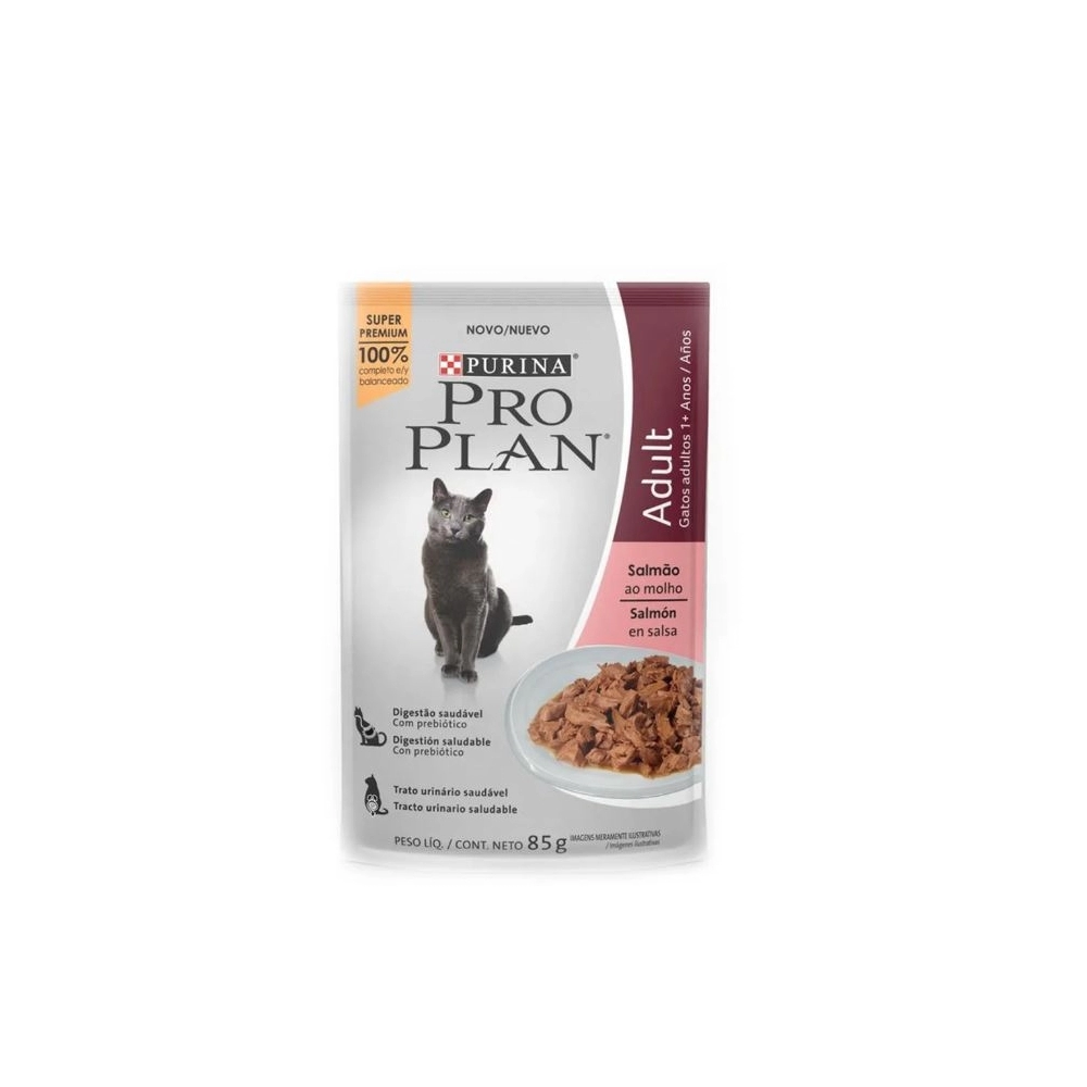 Ração Úmida Pro Plan para Gatos Adultos – Sabor Salmão (85 g) caixa com 15 unidades.