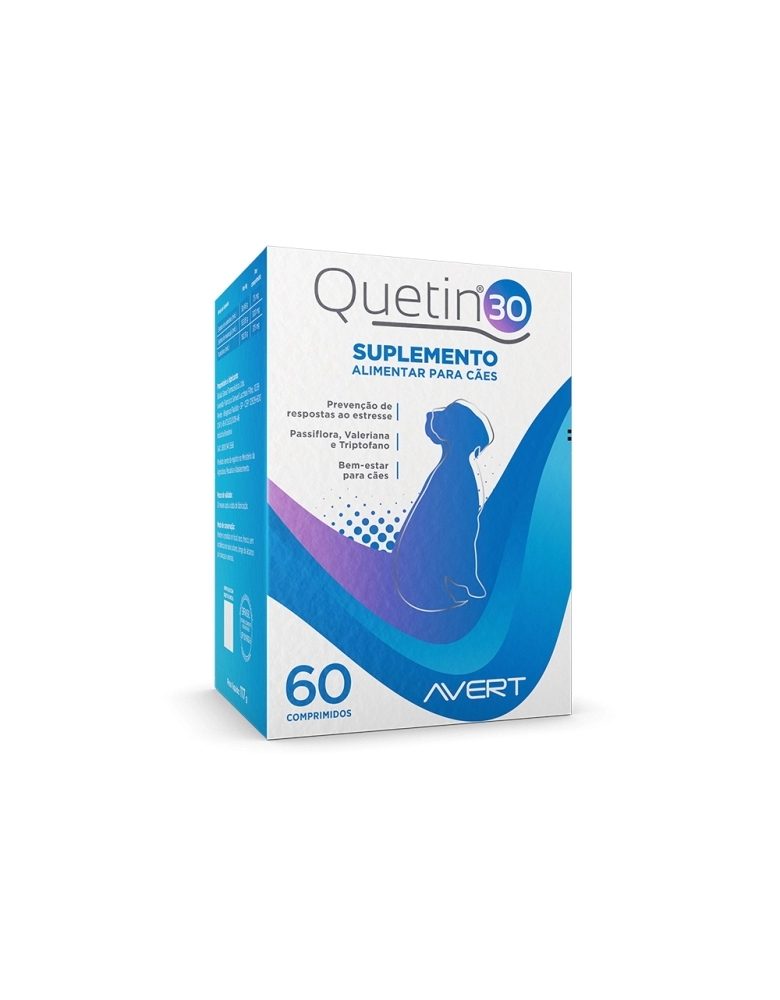 QUETIN® 30 é um suplemento indicado para prevenir respostas comportamentais ao estresse decorrente de estímulos perturbadores, como sons aversivos produzidos por fogos de artificio, gritos, carros e tempestades, auxiliando no bem-estar do animal.