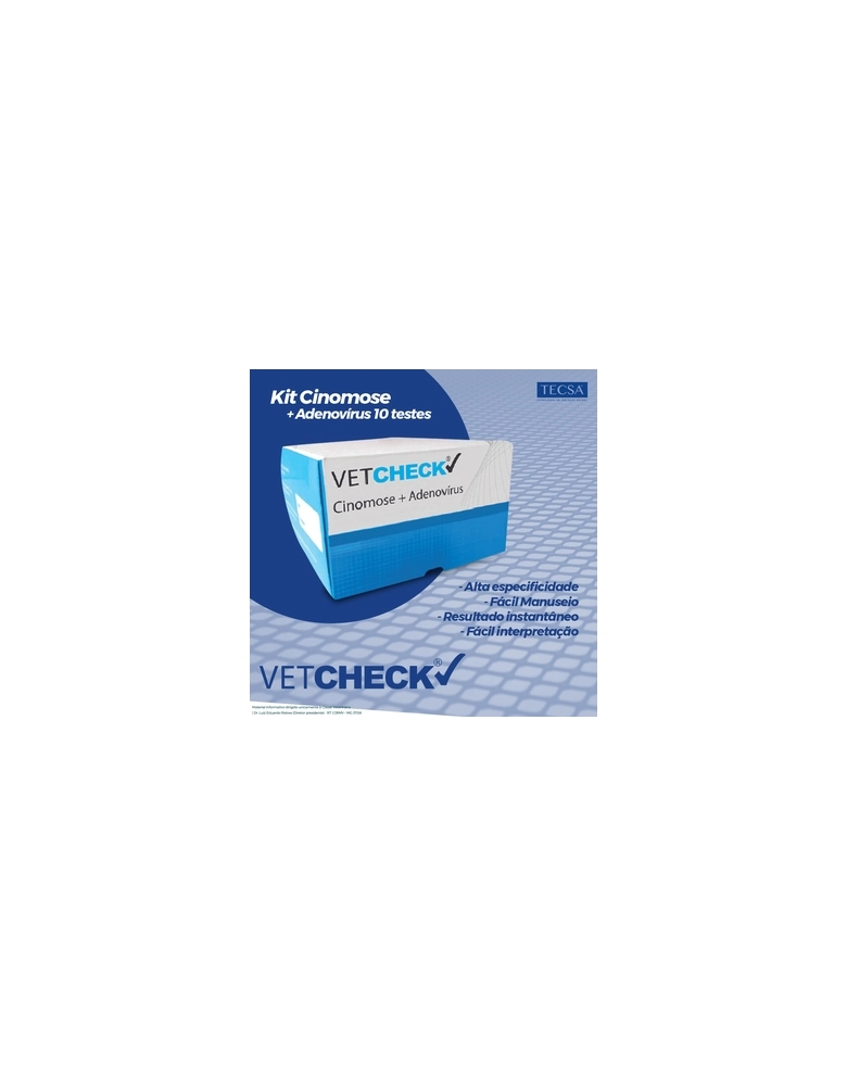 O kit de diagnóstico Vetcheck Cinomose + Adenovírus Canino é baseado na técnica imunocromatográfica projetada para a detecção qualitativa de antígeno de Cinomose (CDV Ag) e Adenovírus canino (CAV Ag).
