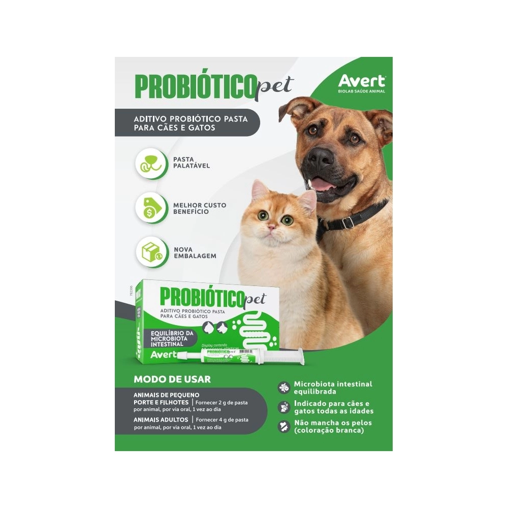 PROBIÓTICO PET é composto por bactérias probióticas que contribuem para o equilíbrio da microbiota intestinal de cães e gatos